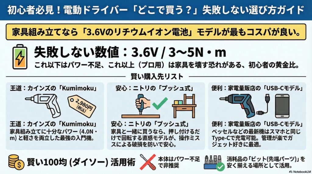• 「電動ドライバーをどこで買うか」という問いの答えは一つではありませんが、自分の目的(家具の規模、使用頻度)を明確にすることが成功への近道です。